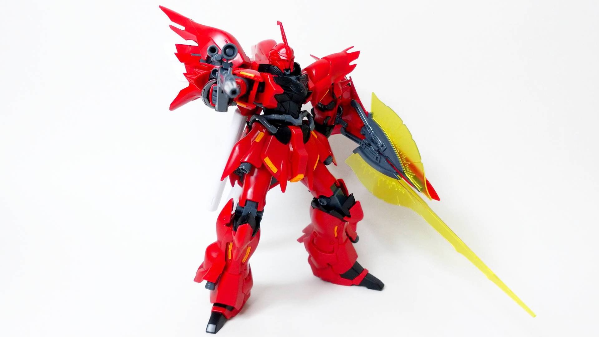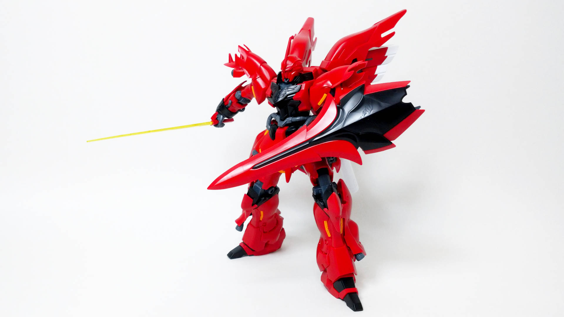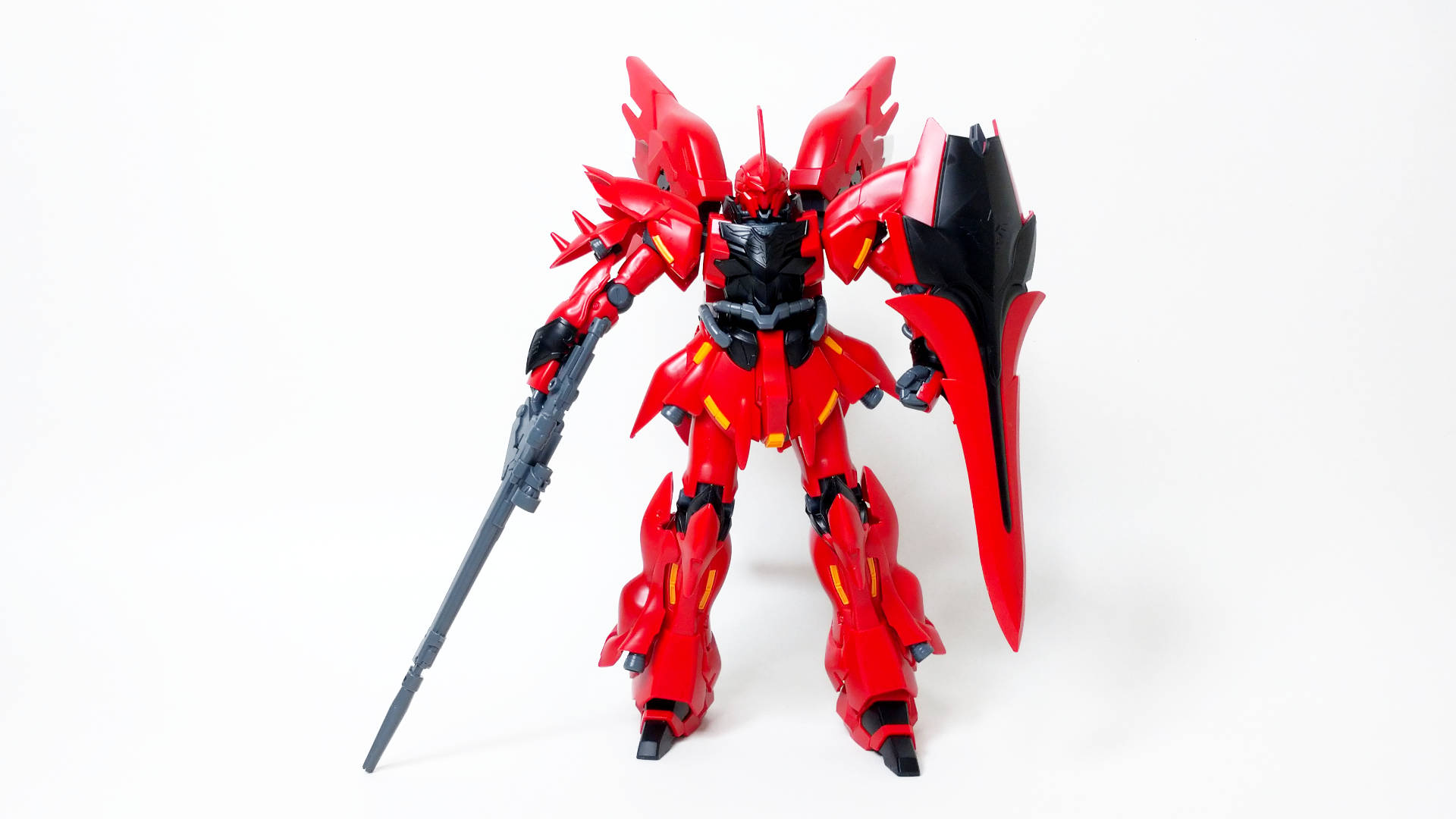 U.C.0094にアナハイム・エレクトロニクス社から『袖付き』によって強奪された試作モビルスーツ。ムーバブルフレームの一部にサイコフレームが採用され、この機体のデータを基にユニコーンガンダムが完成された。『袖付き』のフル・フロンタルの専用機であり、その圧倒的な戦闘力と真紅の姿は、見る者にかつての"赤い彗星"を連想させる。